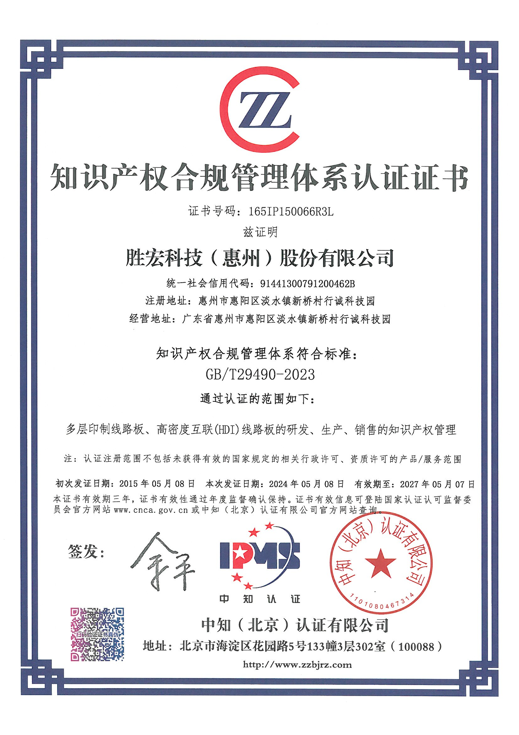 自2013年起,我司便积极响应国家知识产权战略的号召,开始推动和构建《企业知识产权管理规范》GB/T 29490-2013体系。知识产权是企业核心竞争力的重要组成部分,因此,我司致力于通过完善知识产权管理规范与工作流程建设,建立并运行程序化、制度化、规范化、系统化的知识产权管理体系。2015年,我司成功通过外部评审并获得了国家认证,成为惠州市和印制电路板行业首家获得知识产权管理体系国家认证的企业。